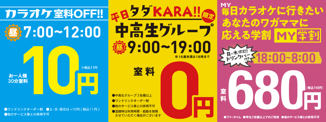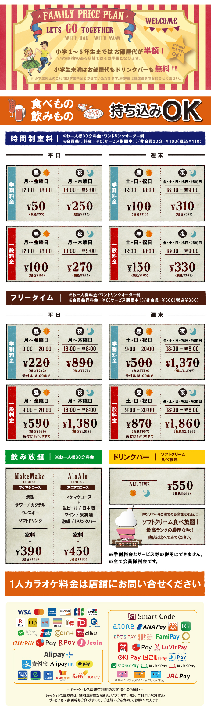 □全て会員様料金となります。入会金は0円(サービス期間中!)、非会員の方は以下の金額がかかります。通常料金→+100円(税込110円) / フリータイム料金→+300円(税込330円)